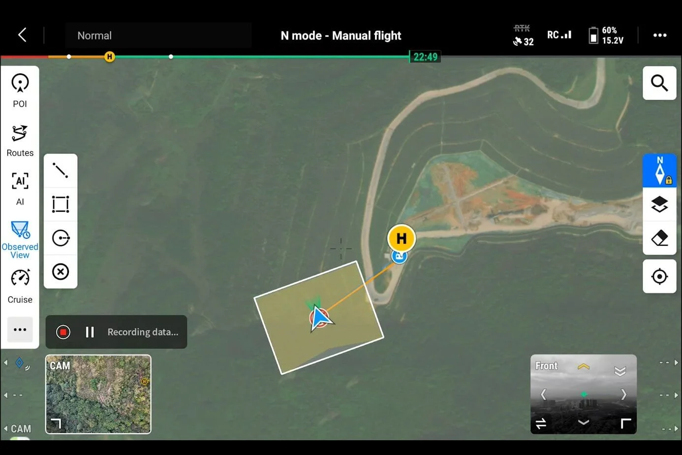 DJI Pilot 2 can highlight the center position of the camera frame and ground area observed. It can display the surveyed area on the map, making it especially useful for patrols, and rescue operations in mountainous terrain without clear landmarks.