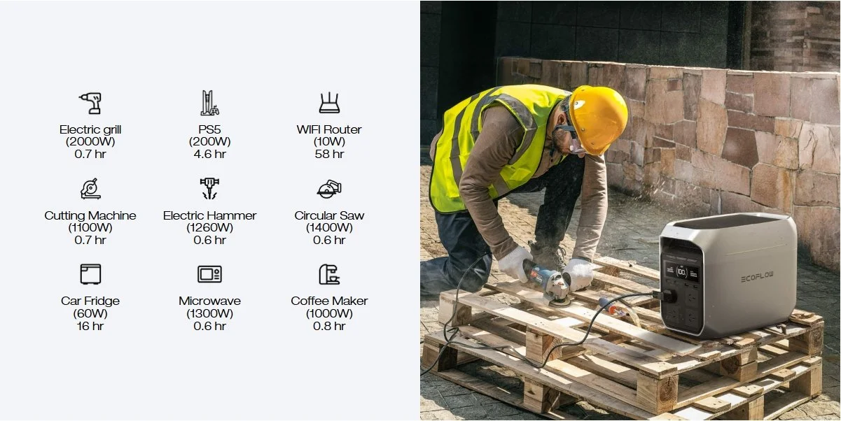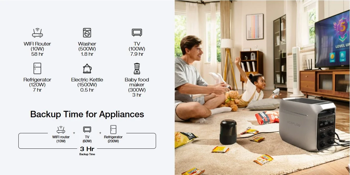 EcoFlow DELTA 3 Plus powers 99% of household devices, including reefrigerators, TVs, and computers. With X-Boost, it handles appliances over 2400W, like ovens (2150W), hair dryers (1800W), and kettles (1200W). Ideal for home backup, RVs, and outdoor adventures, it ensures you'renever left in the dark.
