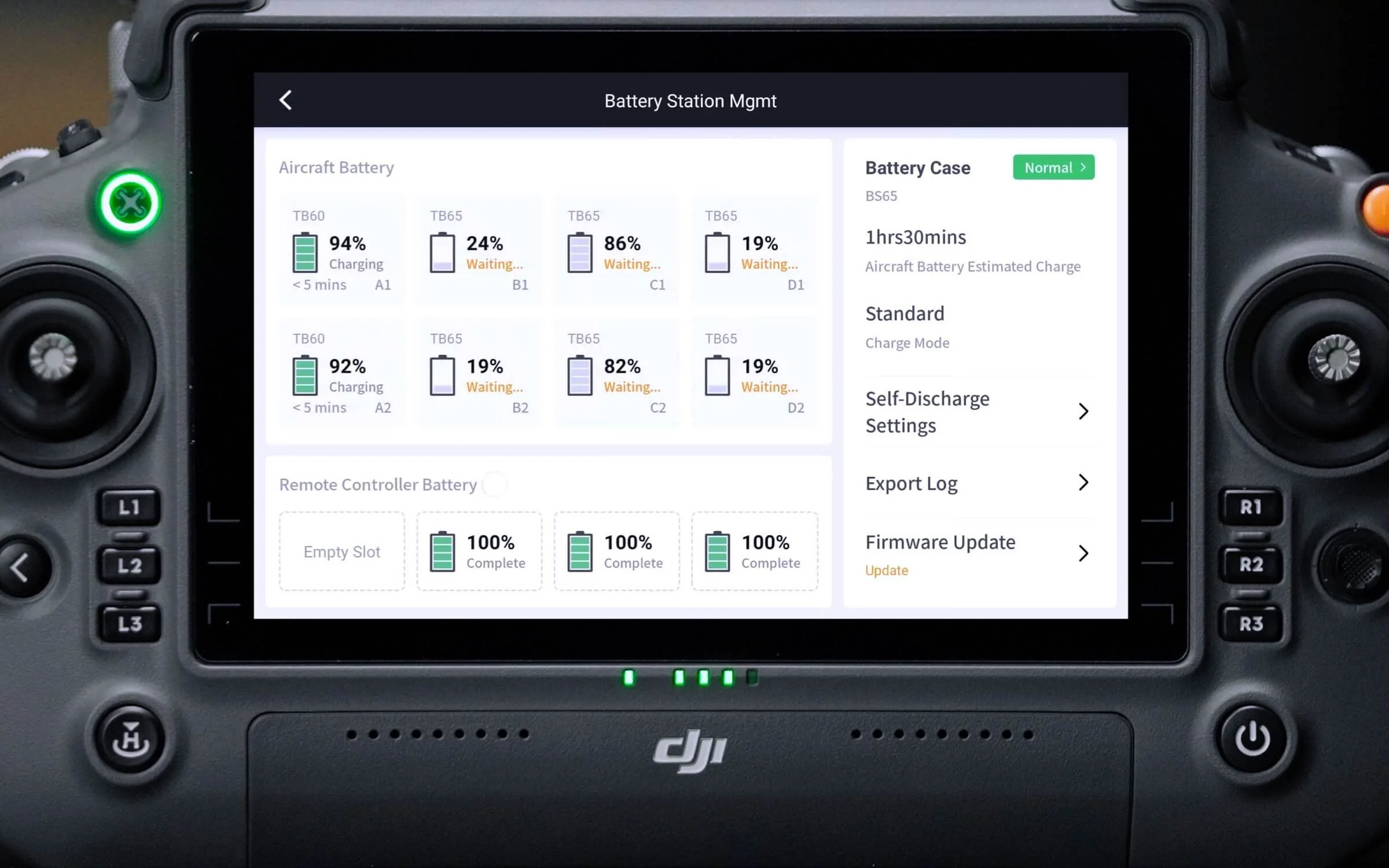 When the battery station is connected to DJI RC Plus, the DJI Pilot 2 app will display the battery status and health information. In addition, you can set the number of self-discharge days, update the firmware, export logs, and access other quick operations with one tap.